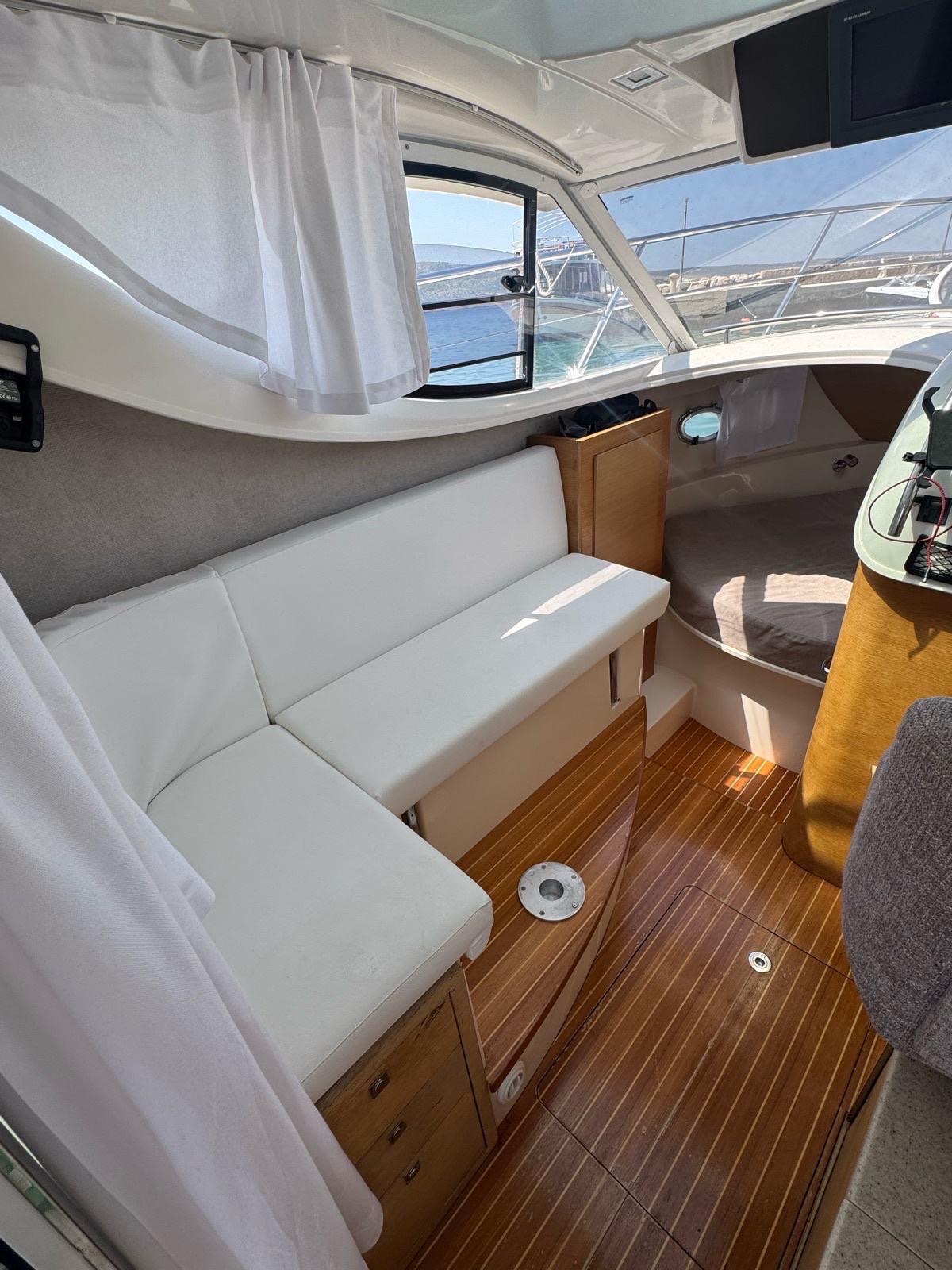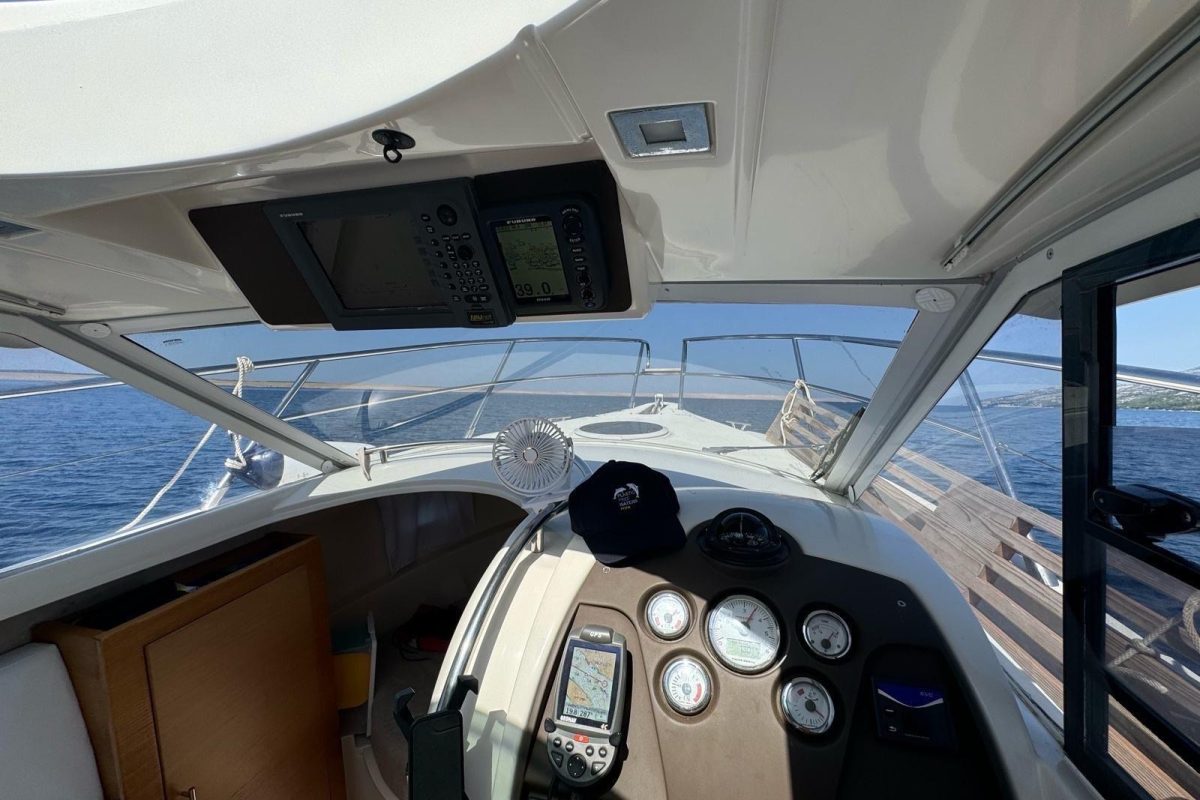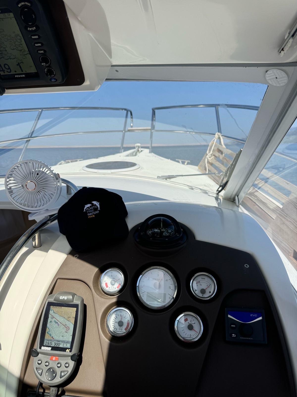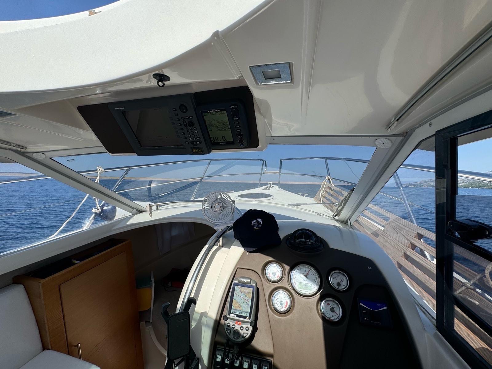 GPS navigation, radar, fishfinder, hydraulic flaps, electric winch with anchor and chain, deck wash, refrigerator in the cabin, gas stove, electric toilet.