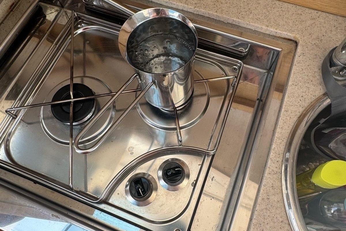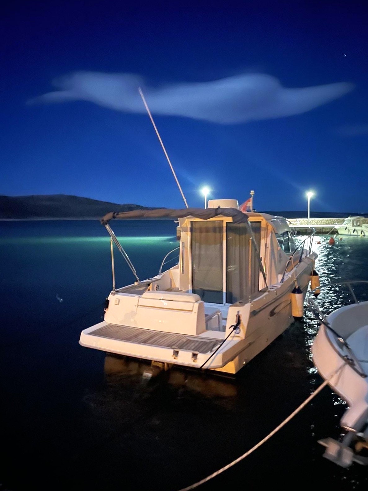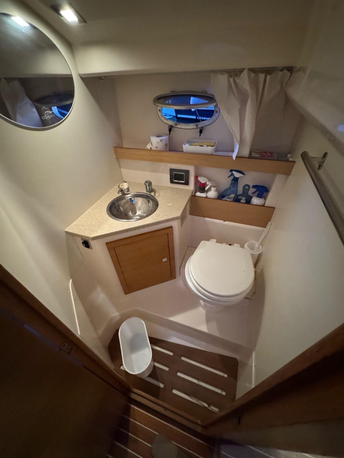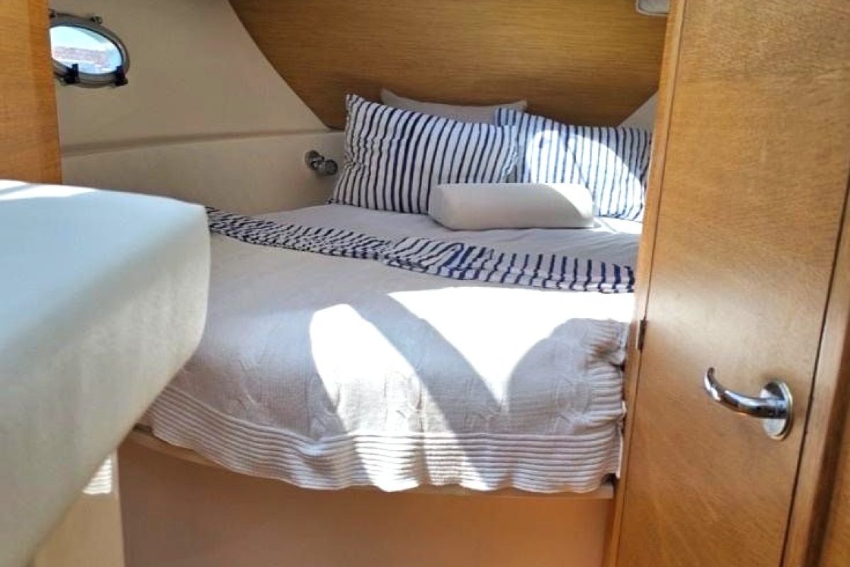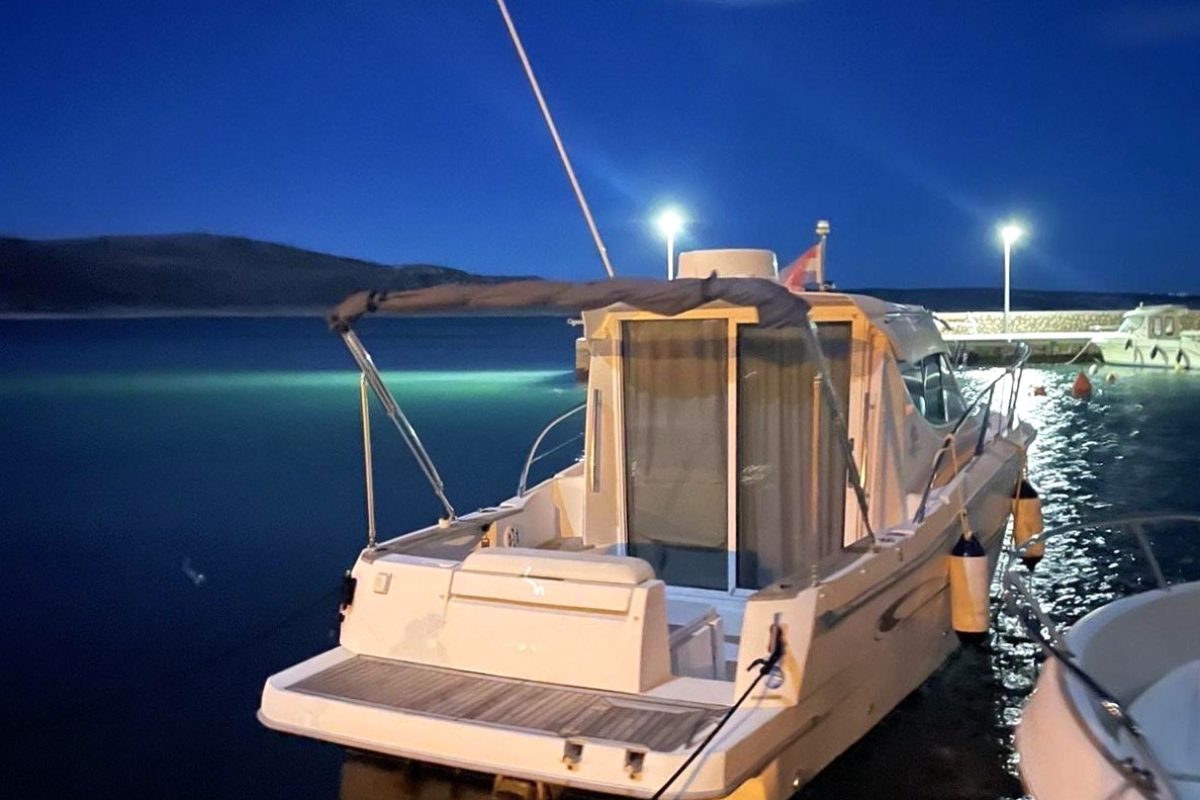 GPS navigation, radar, fishfinder, hydraulic flaps, electric winch with anchor and chain, deck wash, refrigerator in the cabin, gas stove, electric toilet.