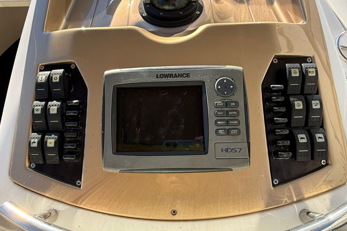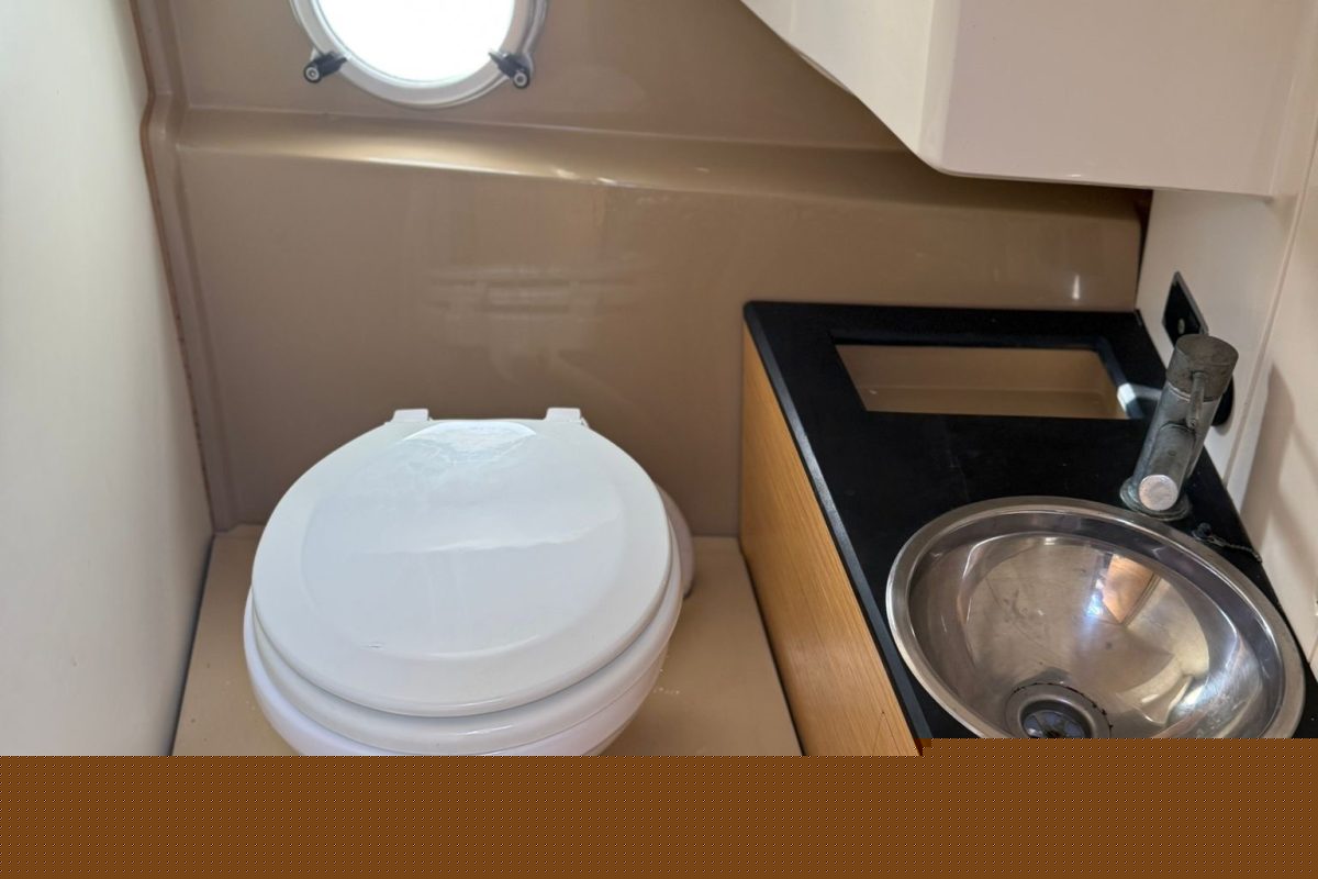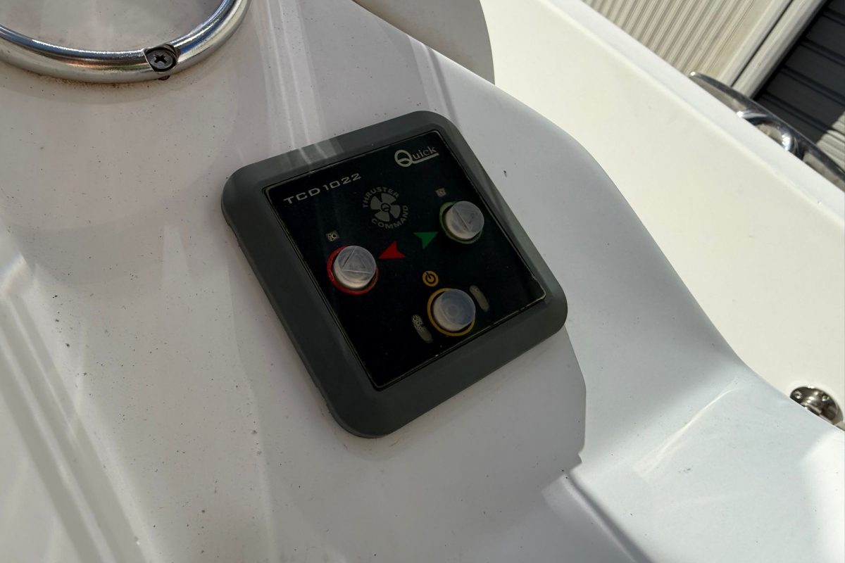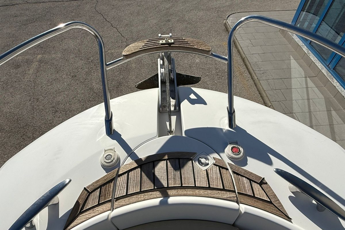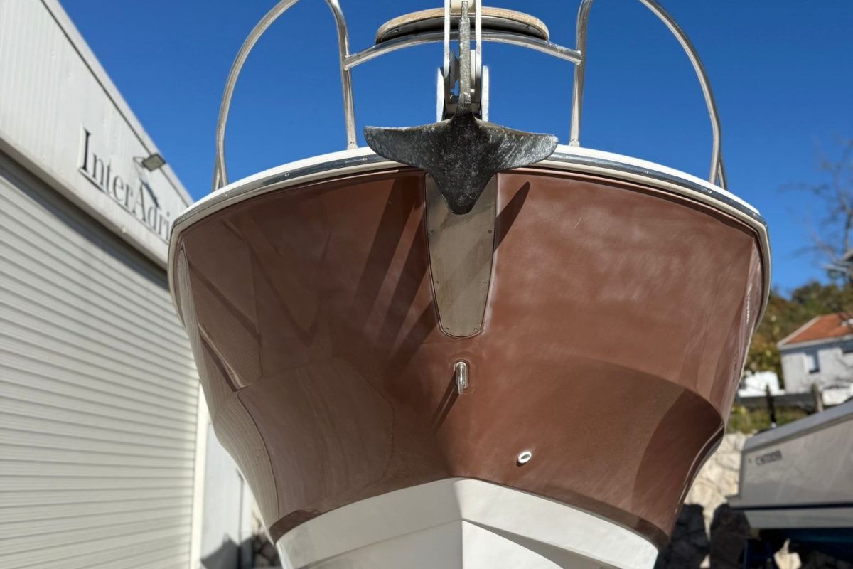 Lowrance GPS navigation, electric winch, bow thruster, two batteries, radio + speakers, refrigerator in the cabin, toilet in the cabin, shower at the stern, bimini awning, teak in the cockpit, brown hull color.