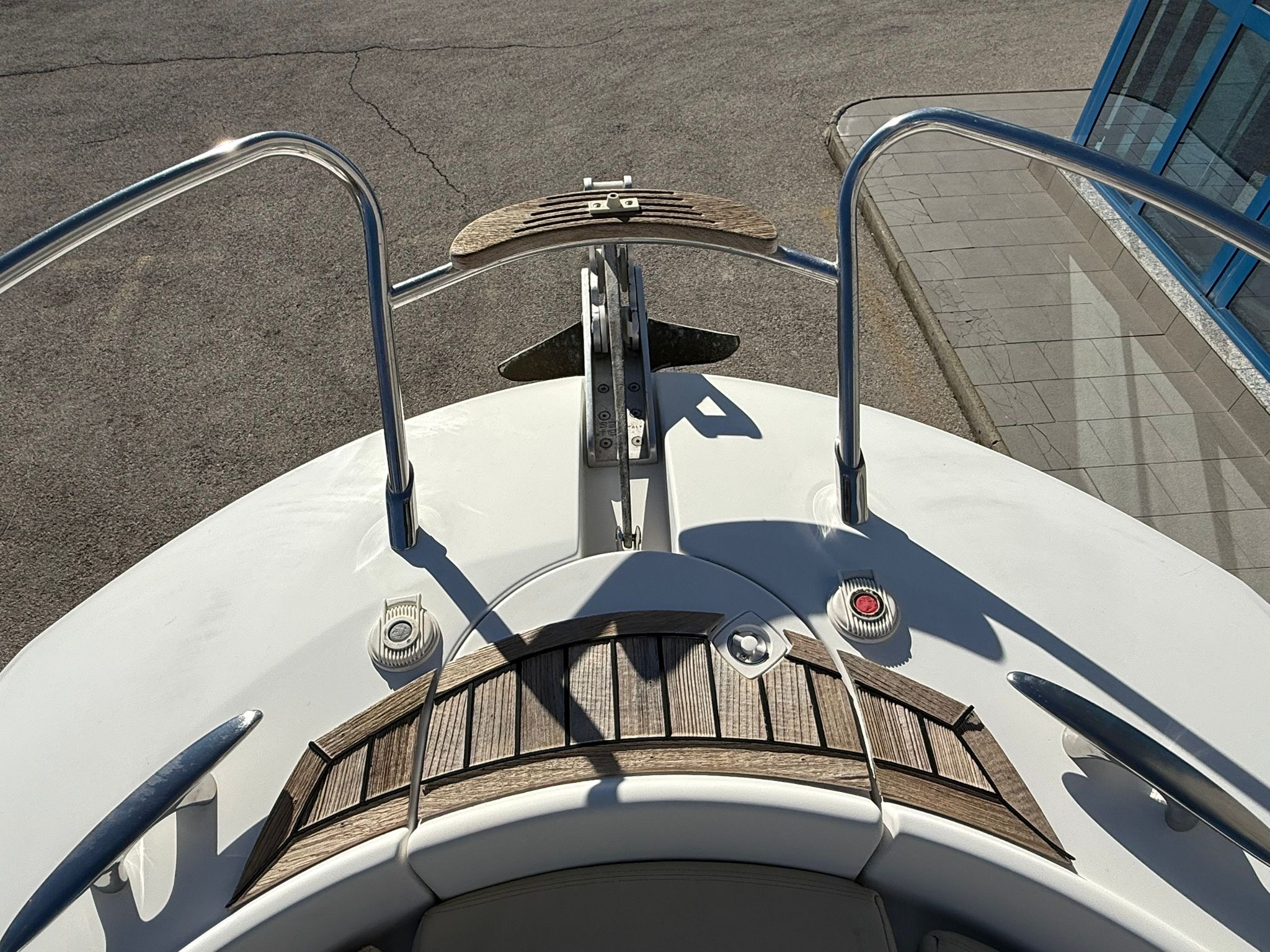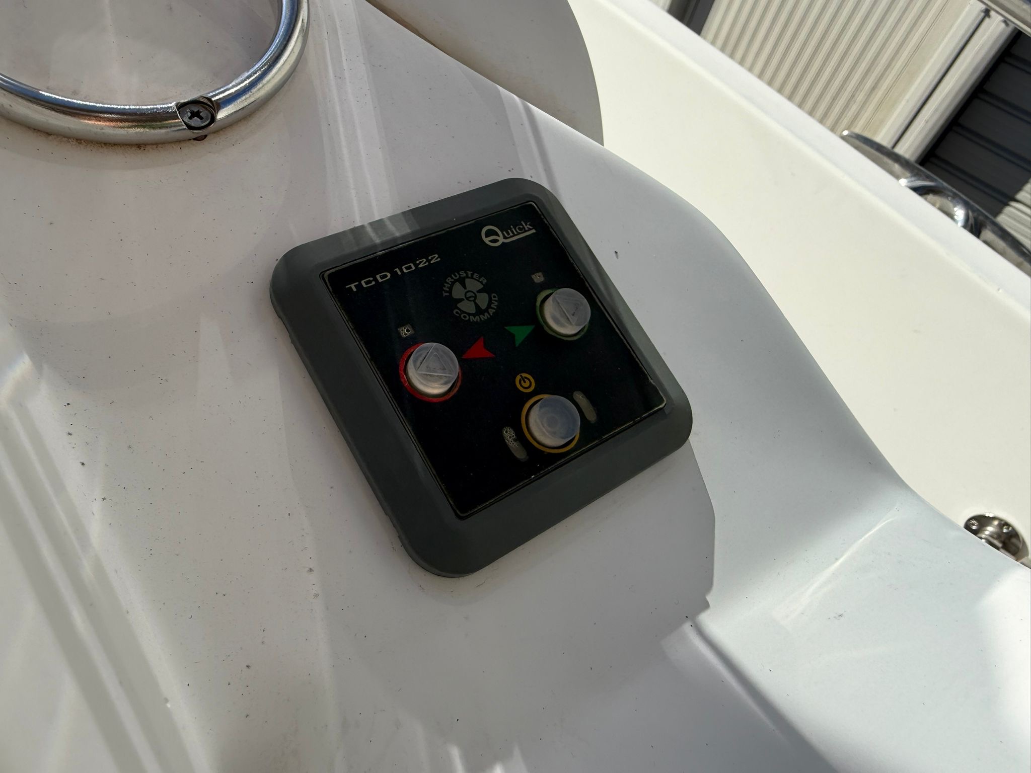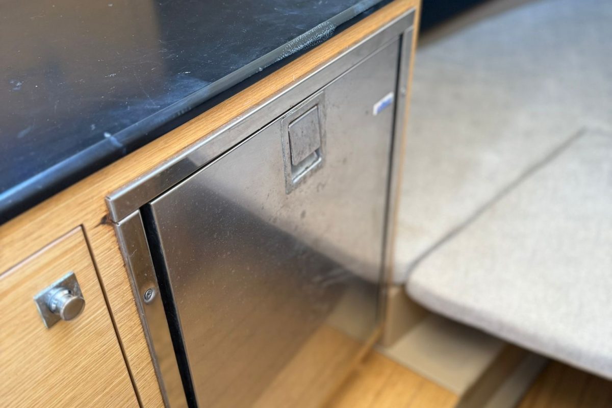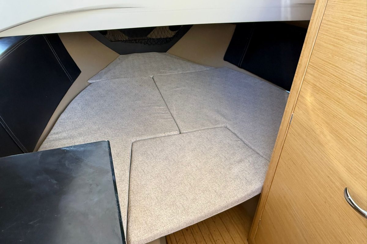Lowrance GPS navigation, electric winch, bow thruster, two batteries, radio + speakers, refrigerator in the cabin, toilet in the cabin, shower at the stern, bimini awning, teak in the cockpit, brown hull color.