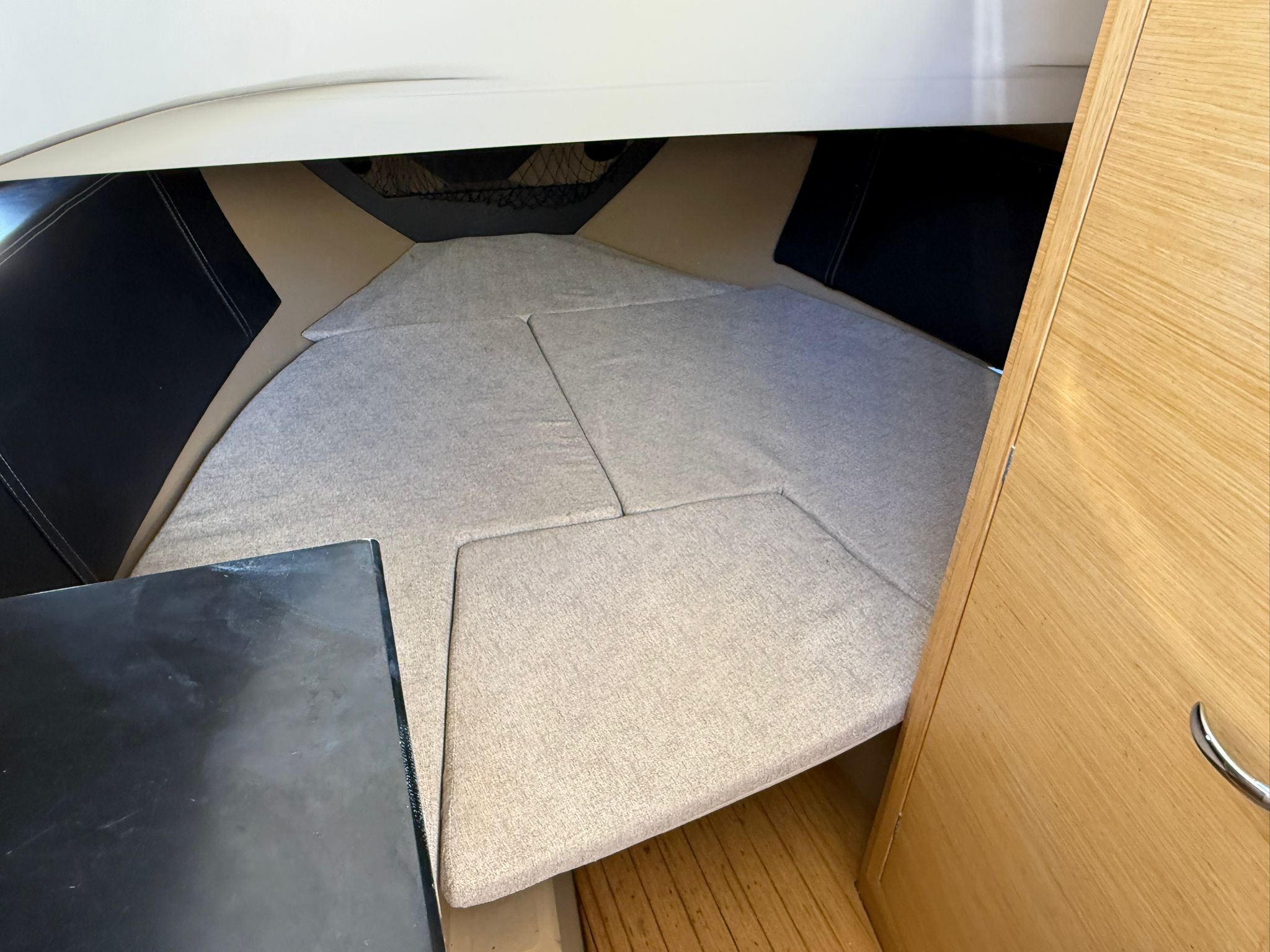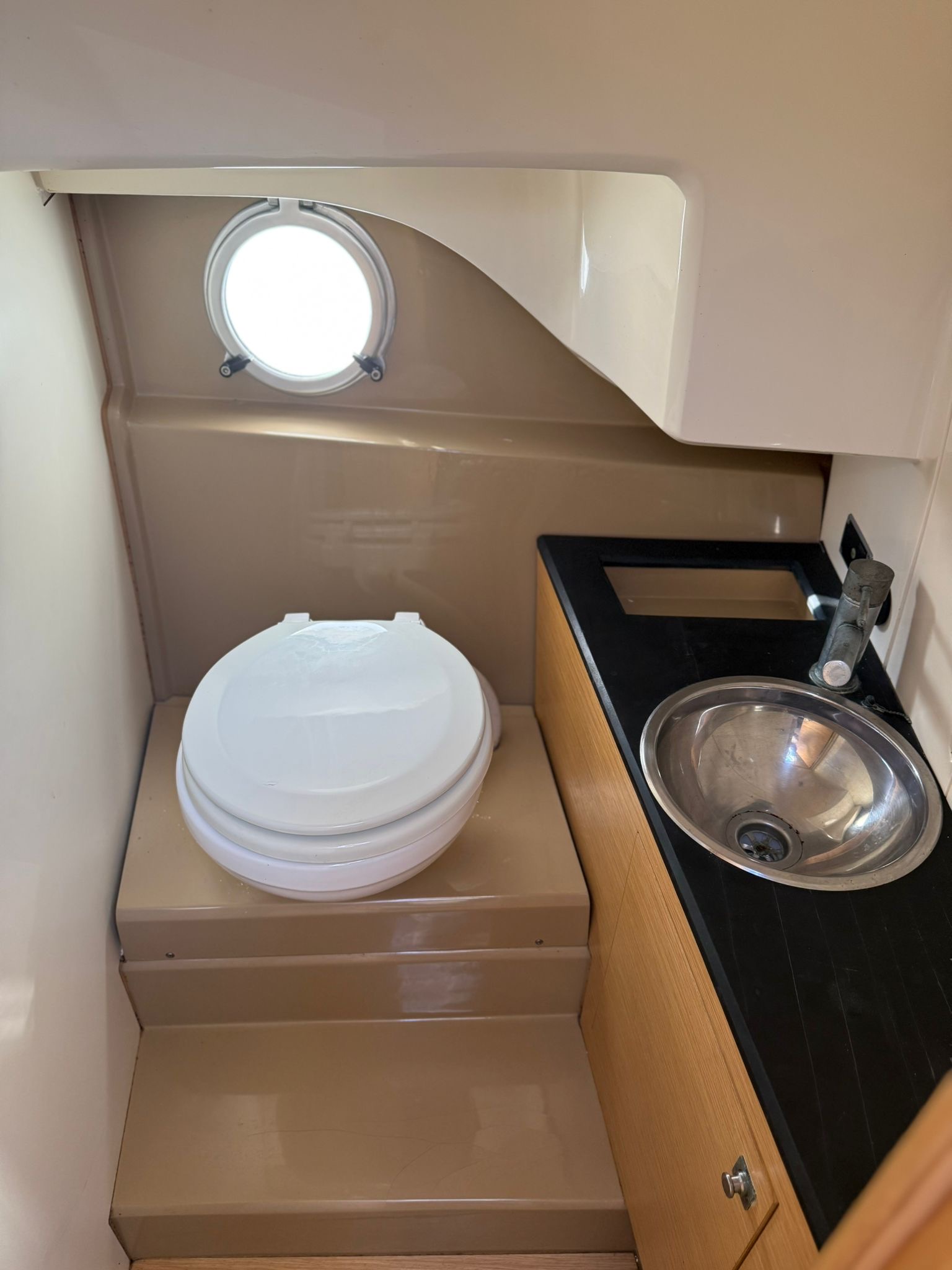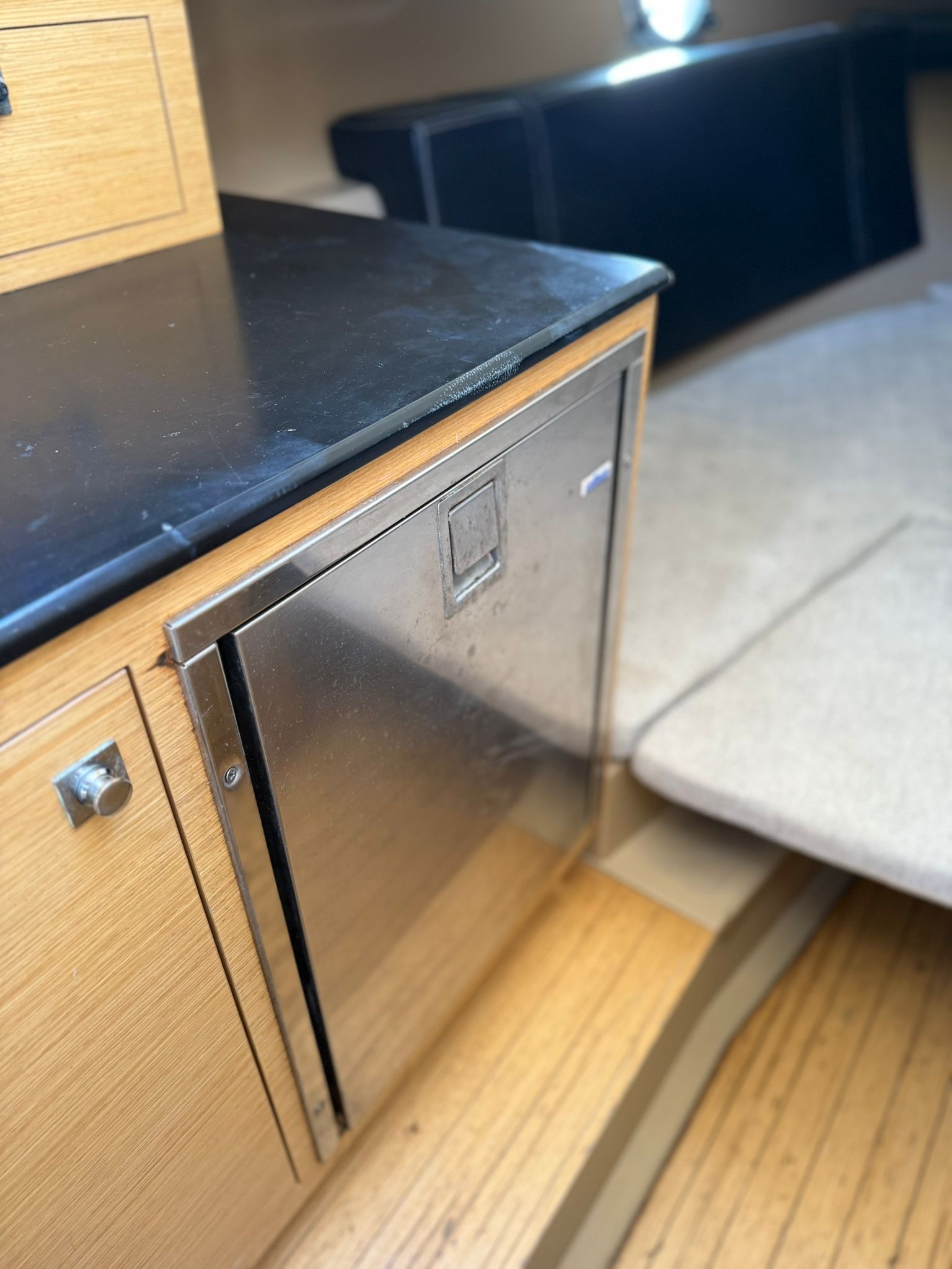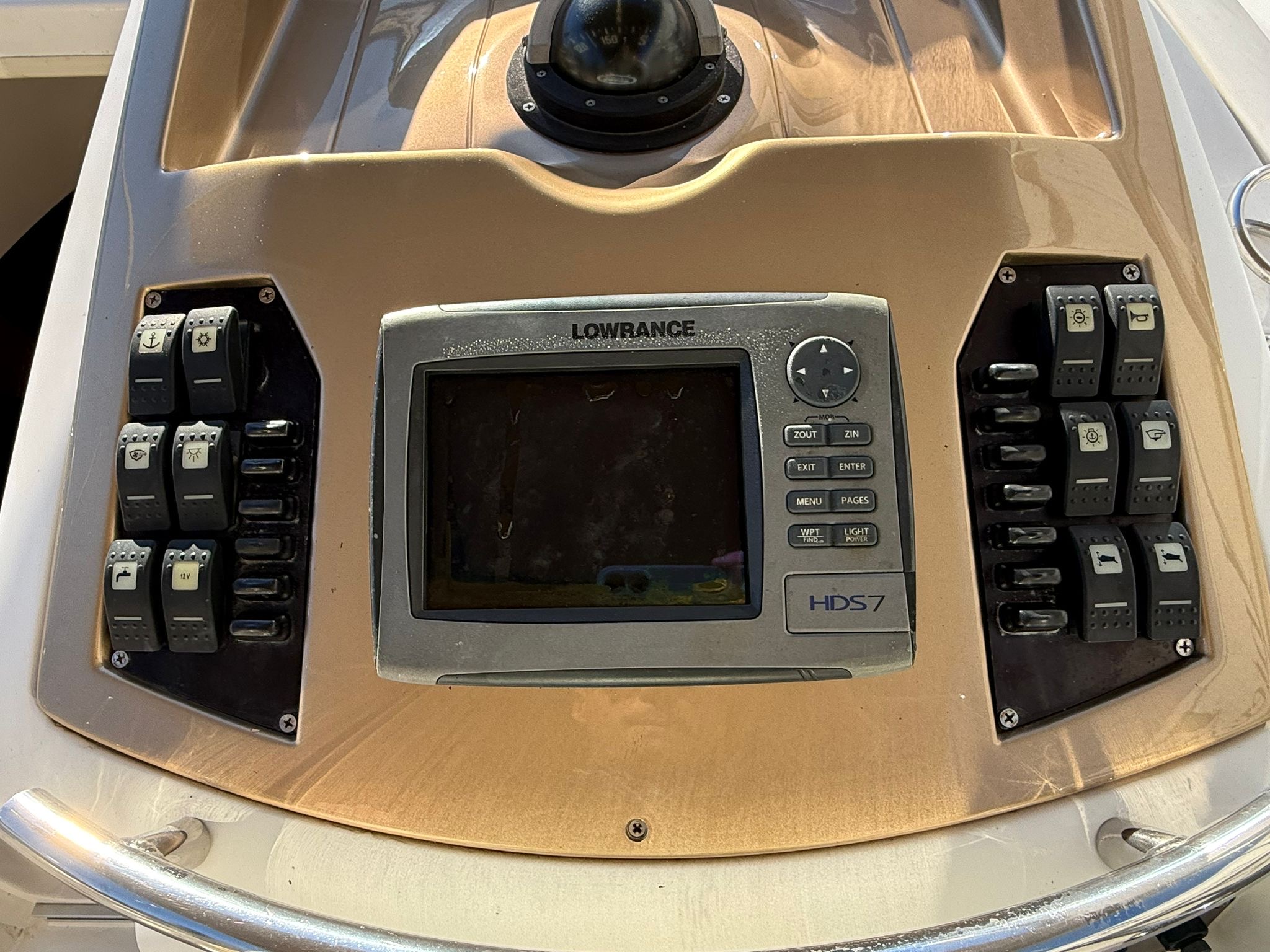 Lowrance GPS navigation, electric winch, bow thruster, two batteries, radio + speakers, refrigerator in the cabin, toilet in the cabin, shower at the stern, bimini awning, teak in the cockpit, brown hull color.